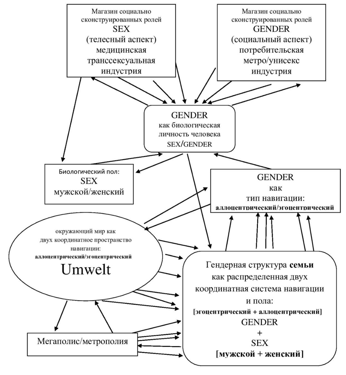 Гендер как тип экологической (Umwelt) навигации человеческого индивидуума является специфической, биологически задаваемой сущностью, развивающейся в онтогенезе и вступающая с такой же биологической сущностью пола в сложные интермодальные семиотические взаимоотношения, с наличием нескольких контуров обратных положительных и отрицательных связей.