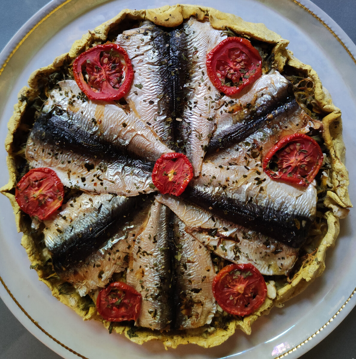 Приветствую вас! Продолжаем тему галет, сегодня рыбные, по случаю четверга). На заглавном фото галета из пшенной, овсяной и муки зелёной гречки (40/30/30) с салакой и овощами (зелёная стручковая фасоль, тыква, сельдерей). Муку смешала, добавила адыгейской соли, прованских трав, 1 чл оливкового масла и добавляя понемногу горячей воды, замесила тесто, пока оно не перестало липнуть к рукам. Скатала в шарик и дала постоять полчаса под плёнкой. Затем раскатала сразу на силиконовый коврик. Удобнее раскатывать под пищевой пленкой. Это не совсем галета, бортики сделала невысокие, вровень с начинкой. Разделать салаку - отрезать голову, хвост и плавники, разрезать брюшко до хвоста, вынуть внутренности. Хребет легко удаляется со стороны брюшка. Смыть черную пленку. Для этой галеты нужно 6 шт филе для верха и 3 шт в начинку. Стручковую фасоль потушить на сковороде до полуготовности. Тыкву, сельдерей и 3 шт филе салаки нарезать на небольшие куски. Всё смешать, добавить зелени и выложить внутрь га
