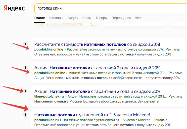 Пример шикарный конечно. Интересно - это идея заказчика или такой "творческий" спец по Директу? В любом случае - конечно такое провисит в Директе не долго и клиент выкинет деньги как минимум за домены на ветер (плюс слитый бюджет). Как максимум - нарвется на блокировку аккаунта в Директе. Четыре (!) одинаковых сайта (на схожих доменах) заняли весь рекламный ТОП : Сайт один и тот же, даже не заморочились на замену телефона Вывод - Директ не проверяет автоматически по контактам рекламные кампании. Это плохо. Наличие таких "спецов", которые так делают - огорчает. Посмотреть бы на то какой этот даст в итоге результат - очень хочется, чтобы оценить цифры провала)