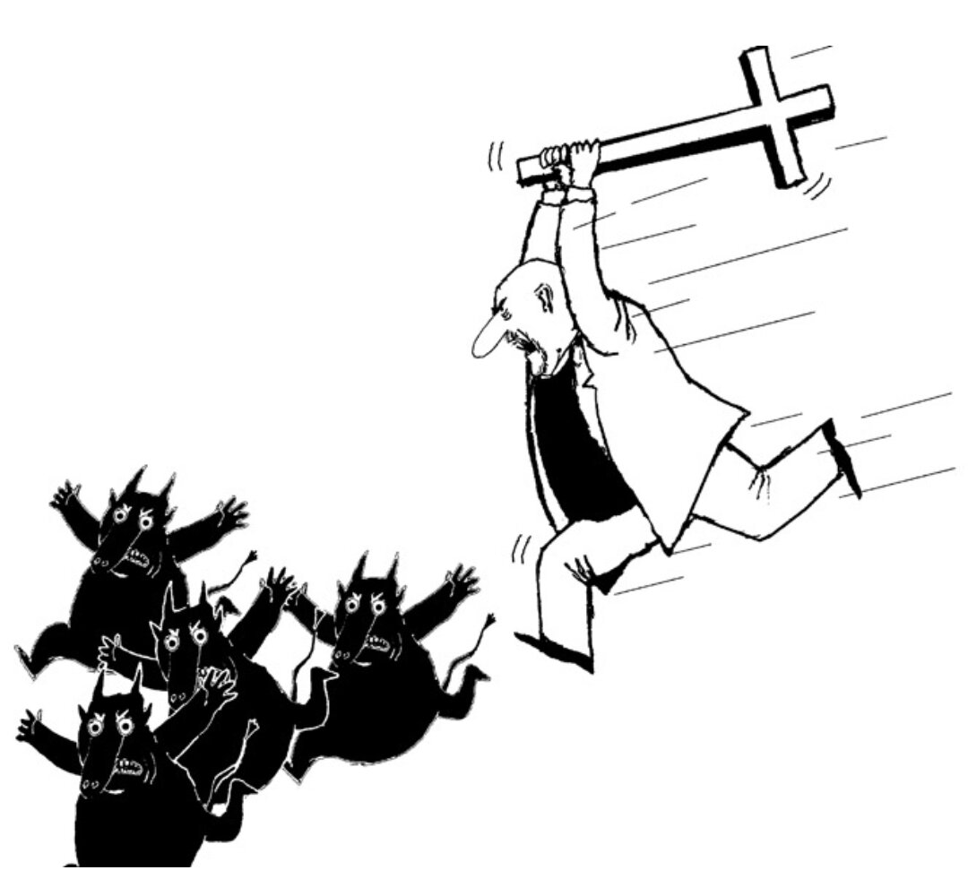 Окруженные прихожанами, Иннокентий и бабка, постепенно начали ходить по кругу, по часовой стрелке. Иннокентий наступал, а бабка отходила, осторожно чертыхаясь и отплевываясь, не давая, однако, грозному попу подойти ближе, чем на три метра. От молитв бабка не просто не потеряла бодрости духа, но наоборот, раззадорилась и стала кривляться и паясничать, посылая проклятия Иннокентию и хуля Господа от всей своей черной души. Отец дьякон, не посвященный в тонкости разыгрываемого спектакля, протиснулся через привлеченную с улицы криками толпу к Иннокентию и протянул пластиковое ведерко, полное святой воды. Иннокентий плескал в бабку, но сил это не возымело. Теперь уже она наступала на Иннокентия и прицельно плевала ему прямо на крест и метясь в лицо. Актерство актерством, но плевки на Символ веры? Такого Иннокентий стерпеть не смог. Он выскочил вперед, окатил бабку с ног до головы святой водой и после еще огрел крестом по голове, под восторженные аплодисменты мирян.