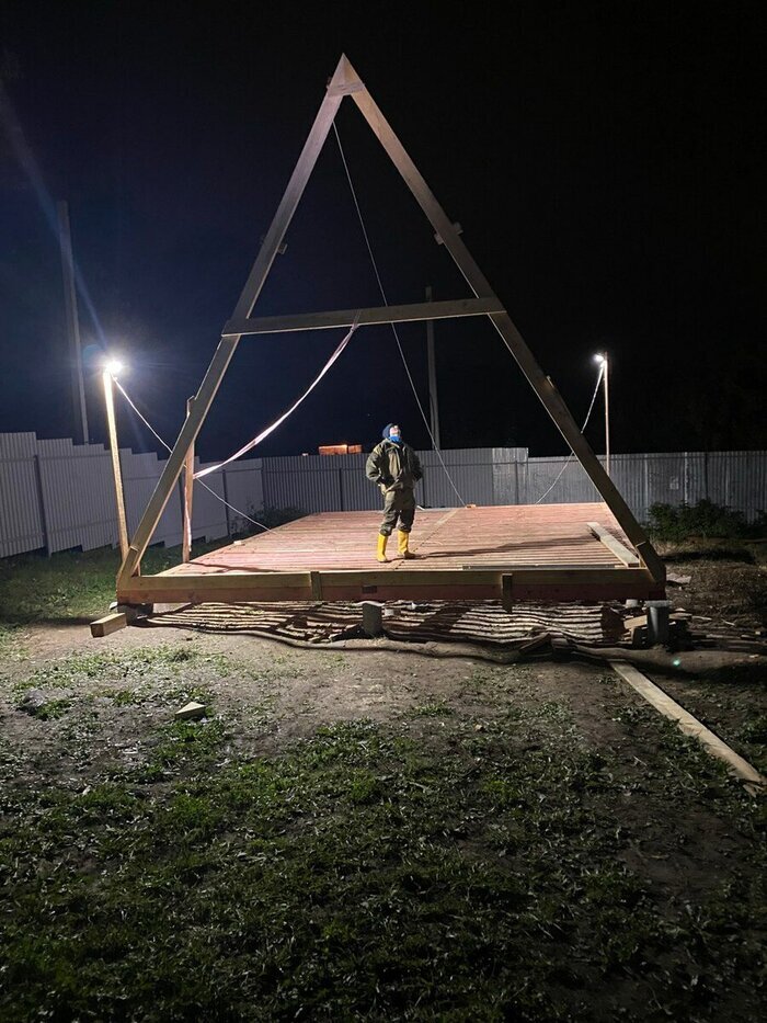 Тем, кто не успел посмотреть, рекомендую глянуть обратную связь, там я рассказал о том, что я НЕ ЗАНИМАЛСЯ СТРОЙКОЙ НИКОГДА:) К делу! Решили, что будем собирать рамный А-фрейм. Для этого делаем шаблонные рамы для сборки и собираем одинаковые комплекты. Соединяем всё через стальные пластины, в которых заранее насверлили отверстий. На половину дома делаем с перемычкой в середине, остальная половина без перемычки. Та часть, которая с перемычкой – часть с комнатой наверху, а без перемычки – «второй свет». Устанавливаем рамы с промежутками 590мм, для удобства установки утеплителя в дальнейшем. Крайняя рама чуть длиннее, т.к. будет расположена под наклоном с вылетом. Потом мы накрыли каркас ветрозащитной мембраной. На стропила нарастили рейки, к которым потом крепим обрешётку кровли. Рейки крепил для получения вентзазора. После обрешётки накидываем листы осб, я накидывал толщину 9мм, в интернетах пишут, что этого достаточно. Осб брали ультралам, она вроде как более влагоустойчивая. Стыки про