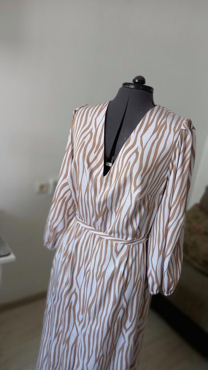 Всем привет! Вот и прошло лето) столько всего шилось, что пришло время показать ) Это платье шилось на 60 размер, на манекен оно очень большое. Мне оно очень нравится, по этому я все таки решила его надеть на манекен, слегка подвязав талию импровизированным пояском. На самом деле, модель платья очень простая, верх прилегающий с нагрудной вытачкой, платье отрезное по линии талии, v вырез горловины, юбка слегка расклешенная к низу) рукав с небольшими складками, сборками по окату, широкий расклешенный к низу, по низу рукава резинка. Ну и стоит отметить сам принт, он очень приятный для глаз , не смотря на то, что это все же зебра, но в глазах не ребит, честно я пока шила, отдыхала, принт как будто гипнотезировал меня) 😀