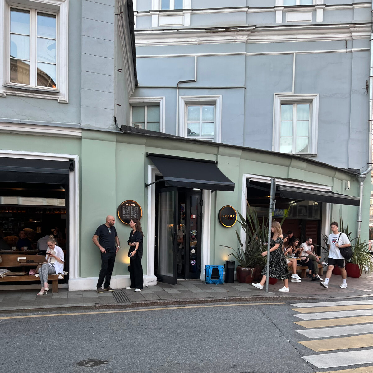 Пересечение бурной, занятой и зачастую вкусной Большой Никитской и Калашного переулка, в нескольких шагах от Никитских ворот. Угловая зеленоватая пристройка первого этажа дореволюционного здания с видом на ТАСС и розовый дом в старом окрасе. Широкие открытые витринные окна в черных рамах и стекляшка-вход с двойными дверями под черными маркизами. С двух сторон от входа черные круги в подсветке, один с меню, другой с названием заведения – Lucky Izakaya Bar: один из первых, если не первый, проект-коллаборация Lucky Group и австралийского шеф-повара, ресторатора Глена Баллиса. Открывшись в конце 2018 года, заведение почти сразу снискало одобрение публики и подошло к своему пятилетию с ежедневной полной посадкой.