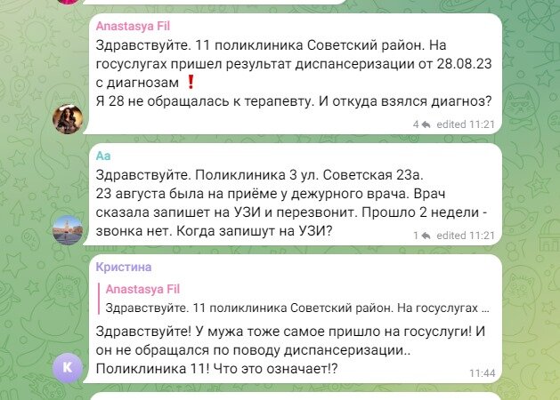 Госуслуги на сегодняшний день рассылают волгоградцам весьма сомнительную информацию о том, что они в своих поликлиниках по месту жительства прошли диспансеризацию. Все бы ничего, но только вот каждый из них заявляет о том, что в медучреждение не приходил, на здоровье не жаловался. Подобные сообщения от волгоградцев стали появляться в чате регионального тг-канала, организованного в рамках федерального проекта «ЗдравКонтроль». Результат о якобы пройденной диспансеризации от 28 августа этого года получила жительница Советского района Волгограда по имени Анастасия. Сообщение пришло в личный кабинет Госуслуг. Тут же женщине был поставлен диагноз. Анастасия призналась, что находится в состоянии глубочайшего непонимания. Ведь 28 августа в поликлинику №11 Советского района Волгограда она не обращалась. Больше всего волгоградку по понятной причине волнует то, откуда взялась информация о ее возможном диагнозе, если врачебного осмотра и манипуляций не было и в помине. Похожим случаем тут же подел