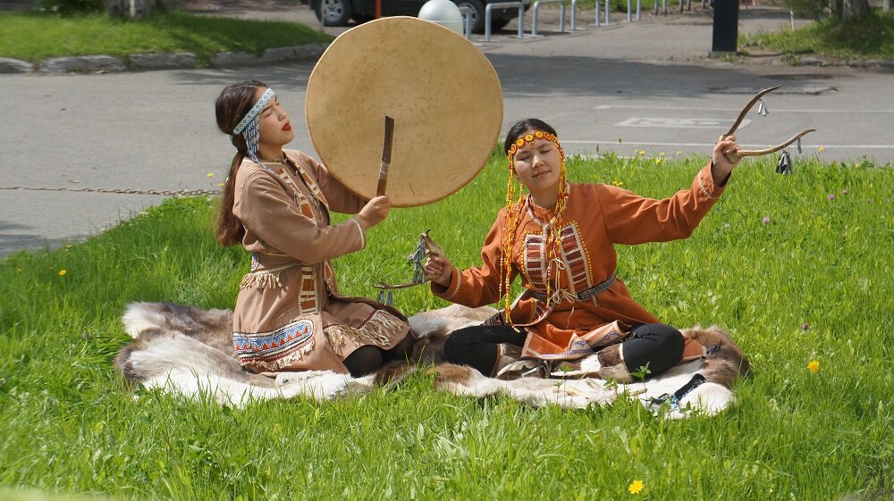 В сценическом костюме, который экспонируется на ЭТНОплощадке, позирует одна из моделей для этюда Ольги Фадеевой «Эвенки». Та, что с бубном в руках. А позируют девушки на зелёном газоне у библиотеки. Чем не таёжная полянка среди высоких лиственниц?