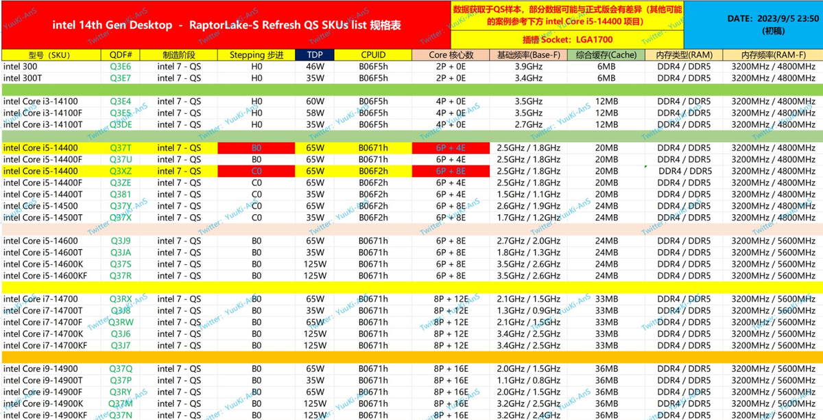 Процессоры Intel Raptor Lake Refresh 14-го поколения должны появиться в продаже в октябре, если доверять утечкам. Несмотря на незначительные изменения в спецификациях, чипы Raptor Lake Refresh будут бороться за место в списке лучших процессоров. Как и при любом выпуске процессоров Intel, сначала на рынке появятся высокопроизводительные модели K-серии, а через несколько месяцев появятся более доступные модели. Таким образом, Core i9-14900K, Core i7-14700K и Core i5-14600K, по всей вероятности, станут первыми процессорами Raptor Lake Refresh, которые смогут приобрести потребители. К настоящему моменту имеется хорошее представление о спецификациях трех чипов K-серии. Однако моделям, отличным от K, не всегда уделяется достаточно внимания. Инсайдер YuuKi_AnS раскрыл предполагаемые характеристики всего модельного ряда продуктов Intel Raptor Lake Refresh. Процессоры маркируются как квалификационные образцы (QS). Это означает, что характеристики могут немного отличаться от розничных экземпляро