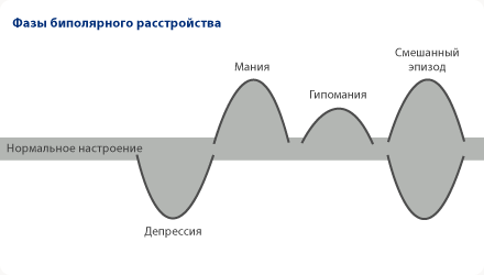 Мне повезло и у меня поставлен БАР второго типа (Нет ярких маниакальных фаз, но на самом деле и гипоманий хватает с головой). Но не повезло с периодичностью фаз. Из-за того, что триггером послужила травма головы, мои фазы меняются примерно раз в 3-4 недели. Без периода нормального состояния. Переход сопровождается смешанным состоянием (что является самым опасным).
