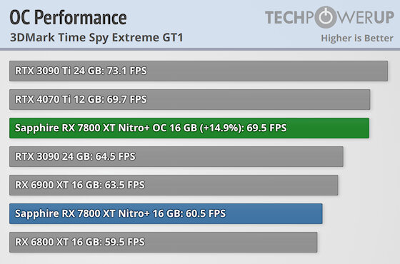 Сегодня в сети были опубликованы обзоры видеокарт AMD Radeon RX 7800 XT и RX 7700 XT. Большинство обозревателей не обратили внимания на разгонный потенциал этих решений, но, как выяснили TechPowerUp, очень даже зря. Коллеги смогли выжать из RX 7800 XT 2936 МГц по чипу при 0,85 В напряжения против 2565 МГц при 1,15 В в стоке. Тестов в играх от TPU мы не увидели, но в 3DMark Time Spy Extreme эта видеокарта изначально была примерно равна RX 6800 XT, но после разгона догнала RTX 4070 Ti, а общий прирост производительности составил целых 14,9%. При этом RX 7700 XT, которая изначально показывает себя немного быстрее, чем базовая RX 6800 (без XT), смогла взять 3133 МГц по чипу при 0,77 В и ускорилась сразу на 17,1%. Эти результаты поставили ее на один уровень с RX 6800 XT и, соответственно, со стоковой RX 7800 XT.