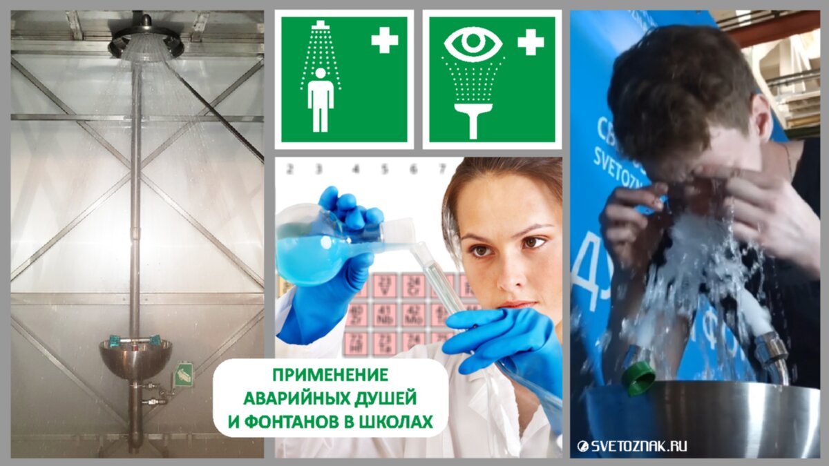 Для сотрудников образовательных организаций, работающих в лаборантских, также необходимы такие средства первой помощи, как фонтан для промывки глаз и/или аварийный комбинированный душ.