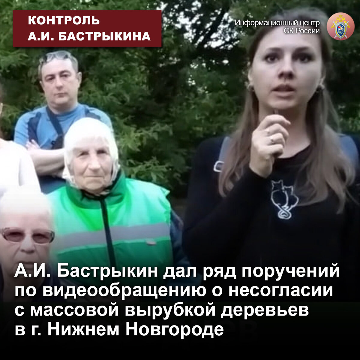 А.И. Бастрыкин дал ряд поручений по видеообращению о несогласии с массовой вырубкой деревьев в г. Нижнем Новгороде В сети Интернет опубликовано видеообращение к Председателю СК России А.И. Бастрыкину от жителей города Нижнего Новгорода. Они выражают несогласие с массовой вырубкой деревьев в прогулочной зоне в Приокском районе областного центра. Общественные слушания по данному вопросу не проводились, а уничтожение зеленых насаждений может негативно сказаться на состоянии окружающей среды и благополучии местных жителей. Также граждане не согласны с решением органов прокуратуры об отмене принятого следственными органами СК России решения о возбуждении уголовного дела. Указанная ситуация ранее получила широкое распространение в социальной сети. Председатель СК России поставил ее на контроль в центральном аппарате ведомства. В целях защиты прав граждан на благоприятную окружающую среду уголовно-правовыми методами в региональном следственном управлении было возбуждено уголовное дело.