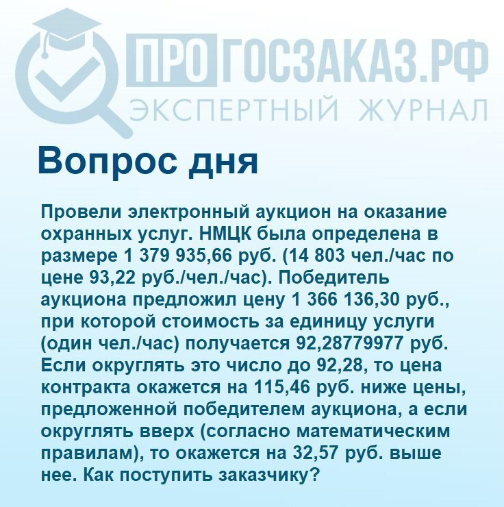 Провели электронный аукцион на оказание охранных услуг. НМЦК была определена в размере 1 379 935,66 руб. (14 803 чел./час по цене 93,22 руб./чел./час). Победитель аукциона предложил цену 1 366 136,30 руб., при которой стоимость за единицу услуги (один чел./час) получается 92,28779977 руб. Если округлять это число до 92,28, то цена контракта окажется на 115,46 руб. ниже цены, предложенной победителем аукциона, а если округлять вверх (согласно математическим правилам), то окажется на 32,57 руб. выше нее. Как поступить заказчику?