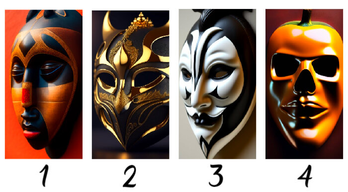 В глубине своей души каждый из нас хранит тайны, чувства и эмоции, которые мы иногда избегаем делиться с окружающими. Это могут быть наши глубокие страхи, скрытые мечты или просто мысли, которые мы предпочитаем оставить незамеченными. Иногда, несмотря на наши попытки скрыть их, эти чувства могут проявляться через наши действия, слова или даже выбор, который мы делаем. Один из способов найти и исследовать эти скрытые аспекты - психологический тест. В этом психологическом тесте, вам представлены четыре различные маски. Каждая из них символизирует определенный набор эмоций и чувств, скрытых в глубине вашей души. Итак, перед вами четыре маски, выберите ту, которая притягивает ваш взгляд, делайте выбор интуитивно! Расшифровка результатов: 1 маска: Если ваш выбор остановился на этой маске, это символизирует ваше сильное связывание с природой и традициями. Вы чувствуете себя частью большого целого и глубоко уважаете прошлое и наследие. Скрываемая в глубине души черта - нужда в понимании и п