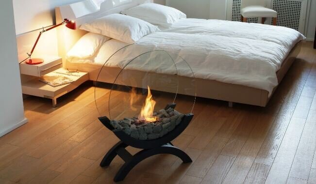 Среди напольных биокаминов есть переносные модели средних размеров с готовой облицовкой. Их можно поставить в гостиной, на веранде или в столовой, а также в спальне для взрослых (в детской открытый огонь нежелателен по очевидным причинам). Отделка биокамина этого типа может быть сделана из металла и стекла либо из дерева, а стиль чаще всего универсален и вписывается в любое окружение.