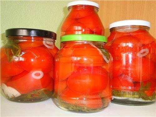 На 4 литровые банки: Маринад: 6 стаканов воды (250 гр) 6 ст.л. сахара 2 ст.л. соли 4 лавровых листика 6 шт душистого перчика горошком Ингридиенты Помидоры Уксус 70% Подсолнечное масло (без запаха) Укроп Петрушка Чеснок Приготовление По стерилизованным банкам разложить по 2-3 веточки укропа и петрушки, по 1 зубчику чеснока, разрезать помидоры пополам и уложить плотно разрезом вниз. Влить в каждую банку по 1 ст.л. подсолнечного масла, 1 ч.л. уксусной эссенции. Залить маринадом и поставить стерилизоваться на 10 минут, закатать.