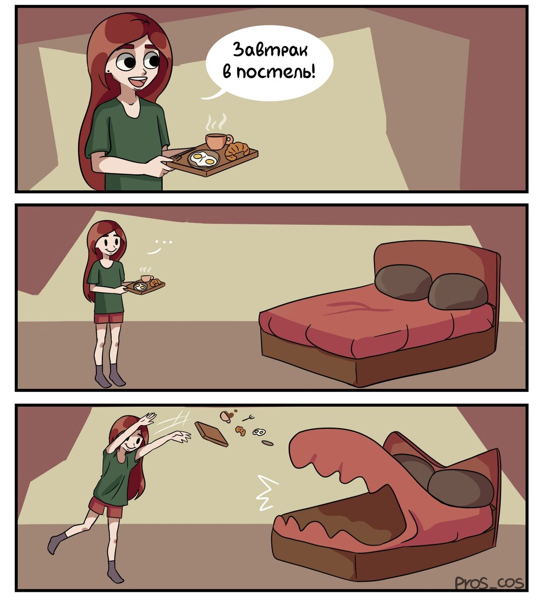 Pros_cos (сокращенно от «Prosto Cosmos») - это название творческого проекта, созданного российской художницей Татьяной Денисовой в 2013 году. Ранее Татьяна жила в Санкт-Петербурге, но не так давно переехала в Москву. В рамках проекта Pros_cos выходят комиксы и иллюстрации - за появлением новых работ можно следить в таких соцсетях, как ВКонтакте, Телеграм и Дзен (суммарно на художницу подписано около 12,5 тысяч человек). Сама Татьяна называет свои зарисовки «простыми комиксами про простые ситуации».