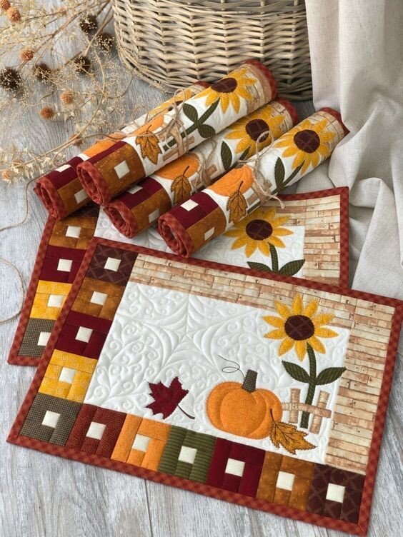 Осень - необыкновенное время. Яркие краски в природе и быстрый круговорот событий. Пока еще не появились серые и унылые пейзажи, нужно успеть налюбоваться шедеврами природы. В пэчворке осень ассоциируется с тыквами, желудями, кленовыми и дубовыми листьями, с пугалом в огороде, реже с подсолнухами, грибами и кукурузой, иногда еще попадаются панно с перцами, томатами или яблоками. Мастерицы делают лоскутные панно, подушки с аппликациями, ланчматы, одеяла, прихватки, дорожки и многое другое. Дом становится необыкновенно уютным, ярким. Оранжевый, желтый, коричневый, неяркий зеленый, темный бордово-коричневый, бордово-красный и редко вкраплениями черный - вот основные цвета осенних проектов. Почти все они на светлом фоне, чтобы подчеркнуть яркость осеннего блока или аппликации. Любой проект украсит художественная стежка на свободном ходу. Изделие становится уютным, душевным. Ниже фото из свободных источников интернета. Оригинально смотрится изделие с имитацией витража.