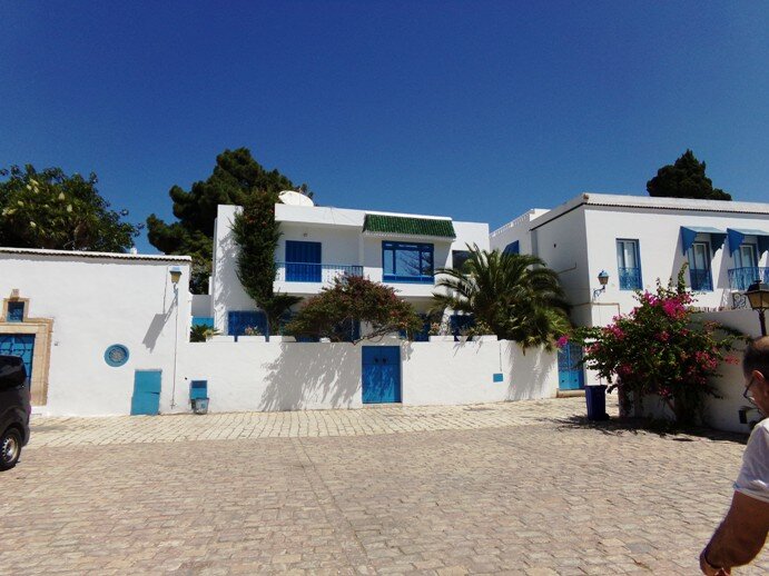 Неподалёку от развалин Карфагена (о них можно прочесть здесь:) на высокой горе, обдуваемой семью ветрами, между небом и землёй, под лучами яркого африканского солнца расположен небольшой (6 тысяч жителей) и очень уютный бело-синий городок под названием Сиди-бу-Саид, у подножья которого расстилается Средиземное море, вдали виднеются Атласовы горы и древний Карфаген. Городок необычен тем, что все его сооружения окрашены в ослепительно белый цвет, а окна, двери, ограждения и решётки - в одинаковые ярко-синие тона.