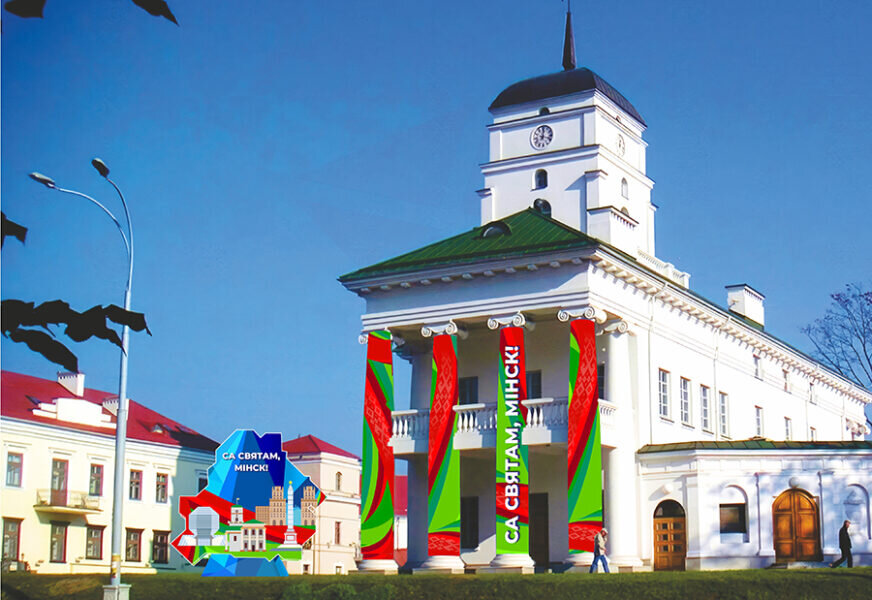 — Свой день рождения столица широко будет отмечать на трех основных локациях: в Верхнем городе, у Дворца спорта и у стелы «Минск — город-герой». В настоящее время оформление этих площадок находится на завершающей стадии, — отметила Т. Бугоркова. — Дизайнерская концепция включает в себя контурное изображение основных архитектурных достопримечательностей Минска на фоне трех ярких цветов: голубого — цвета герба столицы и символа стабильности, спокойствия и несокрушимости; красного, который насыщен зарядом энергии и жизненной силы; зеленого — символизирующего гармонию с природой и заботу об окружающей среде. Эта яркая и нарядная графика украсит колонны городской ратуши и фасад Д