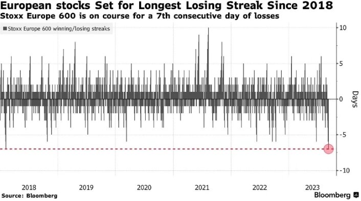 Европейские фондовые индексы падают седьмой день, чего не наблюдалось с 2018 года