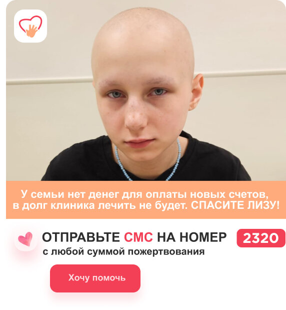 После операции пришли результаты биопсии: убито только 80 процентов раковых клеток. Врачи приняли новый план лечения. Если сейчас не оплатить счёт, терапию остановят. Тогда рост активных раковых клеток будет трудно остановить. Помогите, пожалуйста, Лизе пройти спасительное лечение! ПОМОЧЬ ЛИЗЕ СЕЙЧАС > Здравствуйте, дорогие читатели! К сожалению, предварительные результаты биопсии подтвердились: осталось ещё 20 процентов «живых» раковых клеток. Чтобы победить онкологию, Лизе нужно пройти химиотерапию, аутологичную трансплантацию (пересадку собственной кроветворной ткани) и лучевую терапию. Это длительный, очень сложный и дорогостоящий процесс. У семьи нет денег для оплаты новых счетов, в долг клиника лечить не будет. Отчаянная ситуация! Лиза может умереть, не дождавшись помощи. Лечение ни в коем случае прерывать нельзя. Помогите, пожалуйста, Лизе! ПОМОЧЬ ЛИЗЕ СЕЙЧАС > Стиснув зубы, Лиза терпит боль. Поддержите девочку! Лиза мечтала 1 сентября пойти в школу, встретиться с одноклассникам
