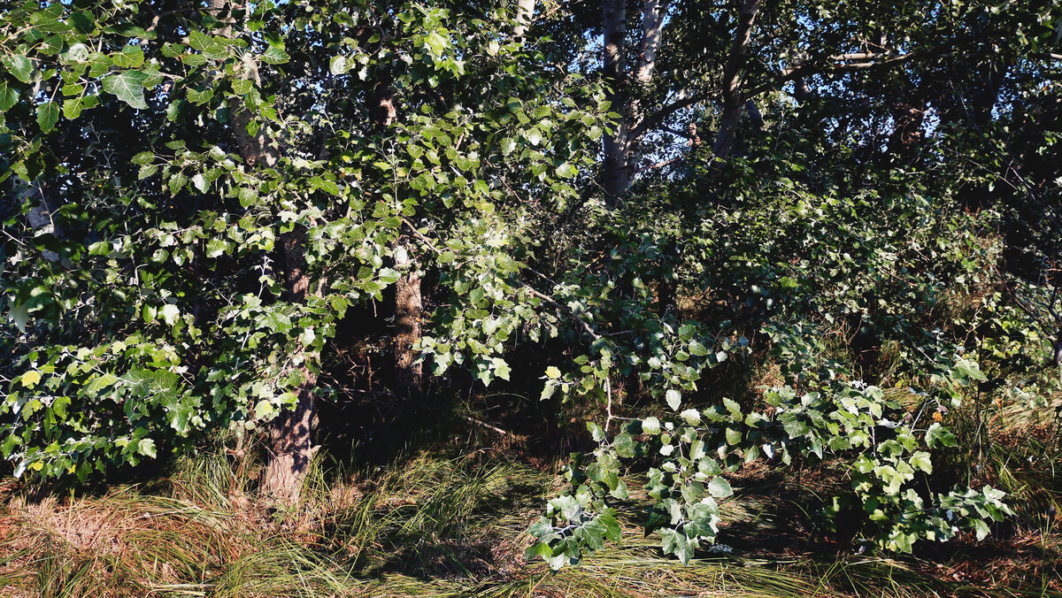 Несколько тополей на залитой солнцем лужайке сильно разрослись и залили пространство вокруг себя густой тенью.