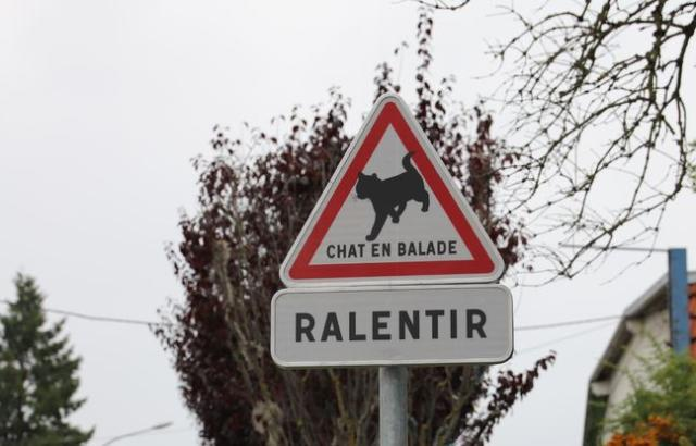 ΠΠΎ Π€ΡΠ°Π½ΡΠΈΠΈ ΠΏΠΎΡΠ²ΠΈΠ»ΡΡ Π΄ΠΎΡΠΎΠΆΠ½ΡΠΉ Π·Π½Π°ΠΊ Ρ ΡΡΡΠ½ΠΎΠΉ ΠΊΠΎΡΠΊΠΎΠΉ ΠΈ Π½Π°Π΄ΠΏΠΈΡΡΡ Β«Chat en baladeΒ» (Β«ΠΠΎΡΠΊΠ° Π½Π° ΠΏΡΠΎΠ³ΡΠ»ΠΊΠ΅Β»). ΠΡ