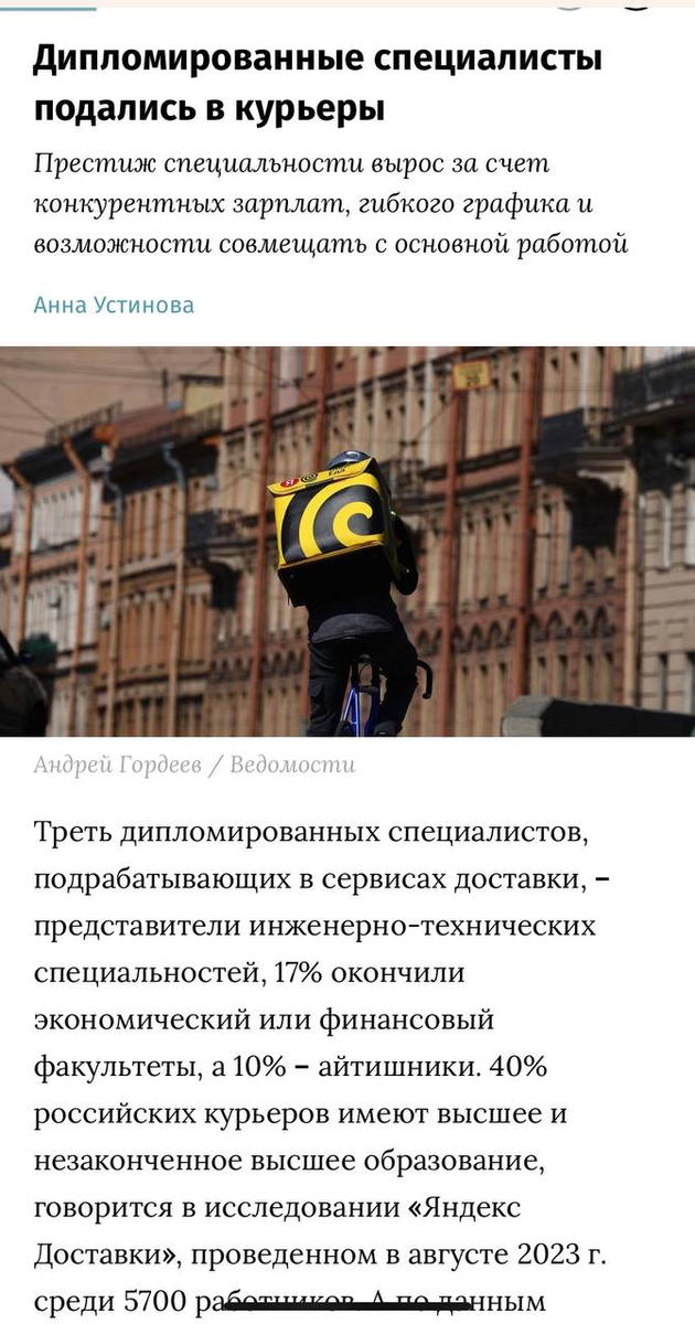 Собственно, ничего нового и я об этом писал много раз. Я много раз говорил о том, что юристы будут не нужны в самое ближайшее время потому что их заменят алгоритмы. Вот смотрите, сейчас мы выстраиваем линию защиты с примением, скажем так, основ искусственного интеллекта. Зачем нам творчество юриста если есть готовые решения по которым судьи ну с вероятностью в 99% принимают решение в пользу наших клиентов. Зачем изобретать велосипед??? Почему идут в курьеры? Да потому что зарплата юриста - 40-50-70 + геморрой от сидячей работы. А курьер бегает и это отличное кардио. К тому же, не каждый юрист может заработать себе столько сколько хочет, а курьер управляет своим временем и своим доходом. Прикиньте на секунду, что курьер управляет своим доходом, а юрист и инженер - нет. Вот так вот. Кстати, спросил у Яндекс GPT почему юристы идут работать курьерами: Юристы - это люди с высшим образованием и хорошими коммуникативными навыками. Они привыкли работать с документами и разбираться в законах.