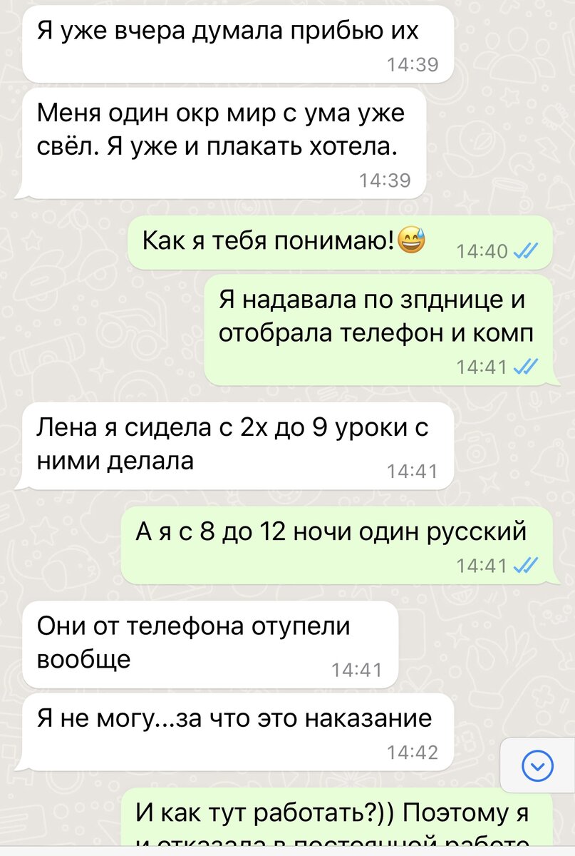 С классной я стараюсь по максимуму не контактировать - боюсь сорваться, ей богу. Я один раз уже на нее наорала. Не то чтобы мне стыдно, вообще не стыдно. Просто я берегу свои нервы и не хочу проживать эти негативные эмоции. Слава богу, сын самостоятельно выяснил, как зовут его англичанку. Но, пока он выяснил, атмосферу в чате старательно накаляли сообщения: «Учите слова по английскому!!!». А я в тот момент не знала, учить ли нам… А ведь можно было просто прислать списки, кто из детей к какому преподавателю приписан. Но зачем? Ведь выедать родительский мозг чайной ложечкой гораздо приятнее.