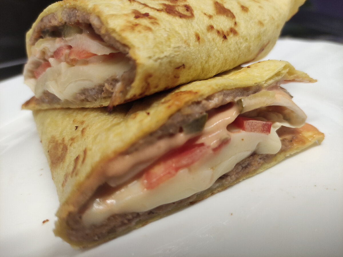 Ингредиенты (всё ингредиенты на ваше усмотрение): На лаваш намазываем фарш и обжариваем на разогретой сковороде на среднем огне. Главное, чтобы мясо не начало вариться. Для соуса огурцы мелко нарезаем и смешиваем с майонезом и кетчупом. На лаваш с мясом кладем сыр. Затем листья салата и помидоры. Выкладываем соус. Сгибаем тортилью-бургер пополам. Можно дополнительно обжарить тортилью на сковороде. Приятного аппетита!