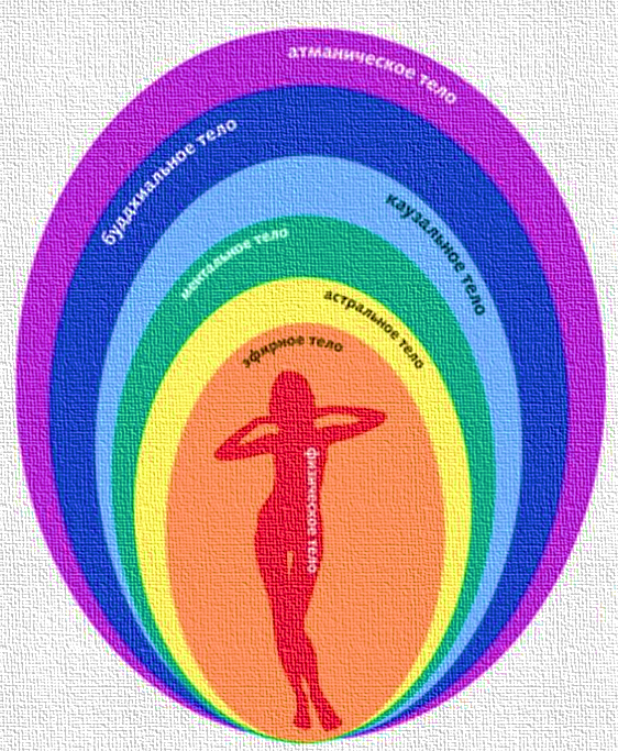 У человека насчитывается семь тонких тел, комплекс которых принято называть «аурой» или «энергетическим полем»: физическое, эфирное, астральное, ментальное, казуальное, буддхиальное, атманическое.