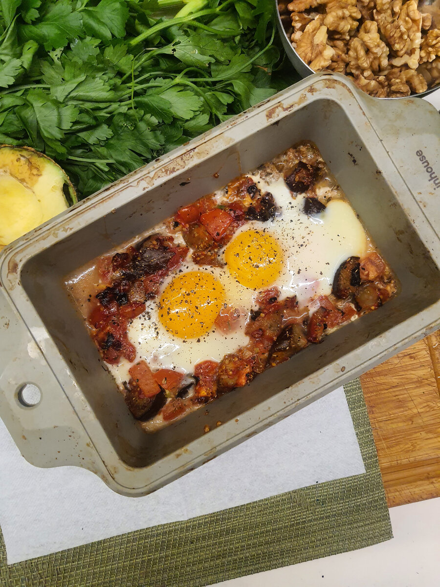 В рубрике Эстетика здорового питания вы никогда не увидите сахара, мучного, круп и других полуфабрикатов глубокой промышленной переработки, равно как и рецептов с зашкаливающими значениями кБЖУ. Рацион, основанный на свежих сезонных овощах и зелени, рыбе и морепродуктах, яйцах, орехах и семечках, фруктах и ягодах, а также натуральных кисломолочных продуктах. Цельные продукты, много белка в каждой порции и минимизация потребления "пустых" калорий - ключевая идея этого канала. Другим ключевым мотивом этой еженедельной рубрики является то, что при всем при этом ваше меню может оставаться вкусным и разнообразным, не заставляя вас отказывать себе практически ни в чем. Я расскажу, как приготовить настоящий брауни, чизкейк или даже пиццу без единого грамма муки (крахмала, манки, овсяных хлопьев...) или сахара, полностью воссоздающих вкус "ностальгических" традиционных рецептов. Авторство фото и блюд принадлежит скромному автору этого блога. 1. Шакшука с баклажанами 2. Салат Цезарь с курицей