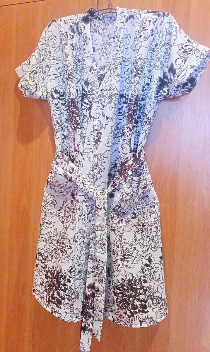 Через два дня едем на отдых в Дагестан. Трое женщин и один мужчина. Забронировали для проживания дом, у каждого будет своя спальня, туалет и ванная одна на всех. И я поняла, что моя привычка ходить утром в места общего пользования в ночной рубашке не годится, надо что-то надевать, а халатов в гардеробе не имею уже много лет. Дома ношу платья летом и костюмы (не спортивные) зимой. Нужно шить лёгкий халат, чтобы не занимал много места в багаже. 25 лет у меня лежала ткань, которую не знаю вообще для чего изготовили - рыхлая полупрозрачная синтетика. Принесла мне её приятельница в комплекте с разными подкладочными тканями и комментарием: - Куда нибудь пристроишь. Наконец пристроила. Выкроила я себе халатик и решила не примеривать, пока не дошью. Вдруг не понравится и придется прекратить работу, а я так люблю этот процесс, уютное стрекотание машинки, пощелкивание ножниц. Вот дошью, тогда и решу, нужно было шить или нет. Вот такая извилистая мысль бродила в мозгу. Могла сшить за 2-3 ча
