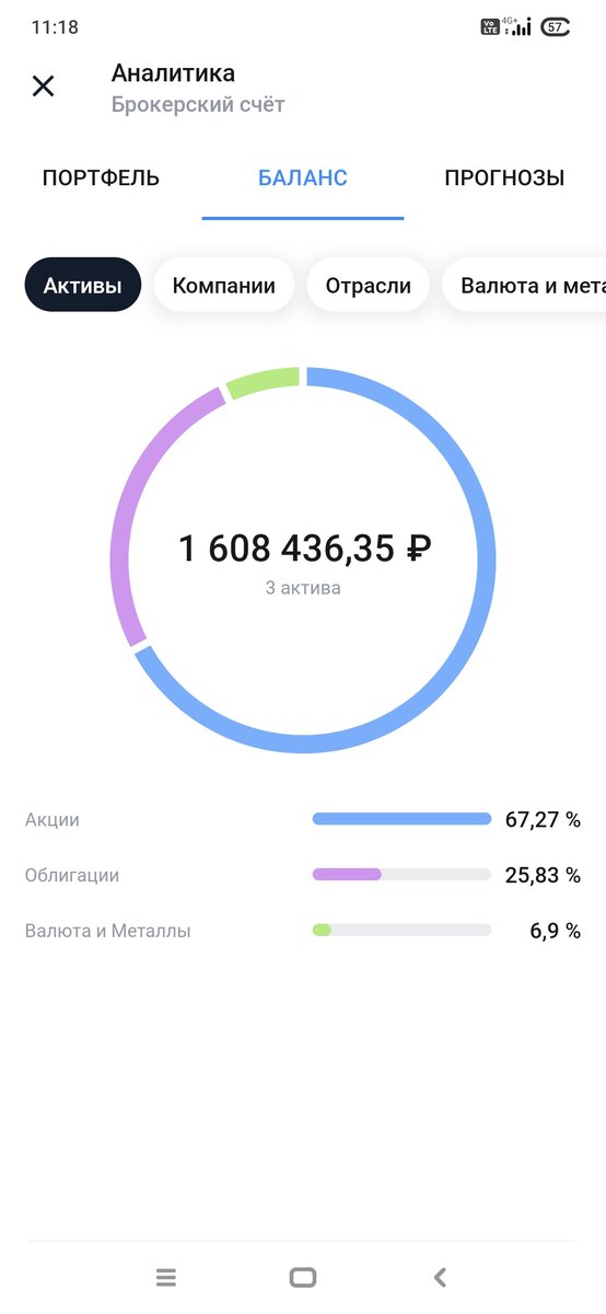 Всем привет инвесторы. Сегодня поделюсь я своим портфелем и расскажу из чего состоит. Баланс на 7 сентября 1 млн 608 тысяч Это мой первый портфель ещё есть счёт в БКС его разберу завтра. 67% акций, 26% облигаций и 7 процентов рубли. На рубли я жду когда сработает заявка на покупку облигаций делимобиль. Да я участвую в размещении третьего выпуска облигаций делимобиля на 105 тысяч. Купон будет ежемесячный по ставке 13,7% меня она вполне устраивает. Первое место занимает Сбер 9,83% на счету 600 акций. Цель 2 тысячи акций Второе место Лукойл 9,82% на счету 23 акций. Цель 100 акций Третье место Татнефть 9,76% на счету 260 акций. Цель 1 тысяч акций Третье место Норильский Никель 8,41% 8 акций. Цель 20 акций Четвёртое место ОФЗ 7,99% три разных выпуска в общем 170 облигаций И пятое место замыкает Северсталь 7,67% 90 акций. Цель 250 акций А также небольшие доли в компаниях НЛМК - 400 акций, ММК- 400 акций, Московская биржа -110 акций, Новатэк - 25 акций, Алроса - 410 акций,