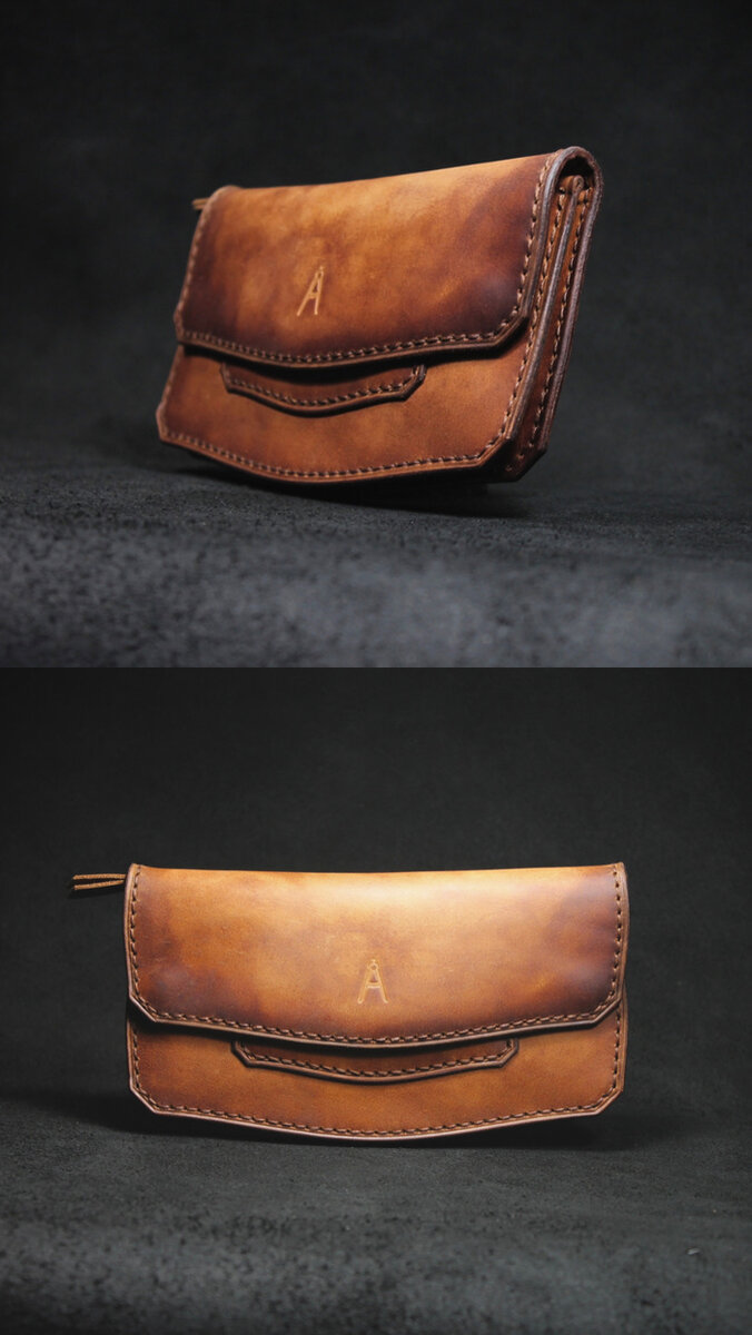 Кожу взял комбинированного дубления и как следует провощил масло-воском собственного изготовления. Для полировки и затемнения краёв использовал войлочный круг. Кошелёк имеет три отдела и карман для «горячей» карты.