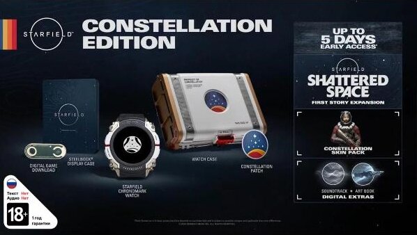 За основу обзора взята статья - Коллекционное издание Starfield со смарт-часами из игры уже доступно в российских магазинах, но цена кусается>>> Компания-импортёр «Ачивка» сообщила о премьере в российской рознице коллекционного издания горячо ожидаемой космической ролевой игры Starfield от Bethesda Game Studios — в один день с мировым релизом. Комплект называется Сonstellation Edition и, помимо кода на загрузку игры, включает стилбук, нашивку «Созвездие» и цифровые материалы (ранний доступ к игре, аддон Shattered Space (когда он выйдет), артбук, саундтрек, облик.
