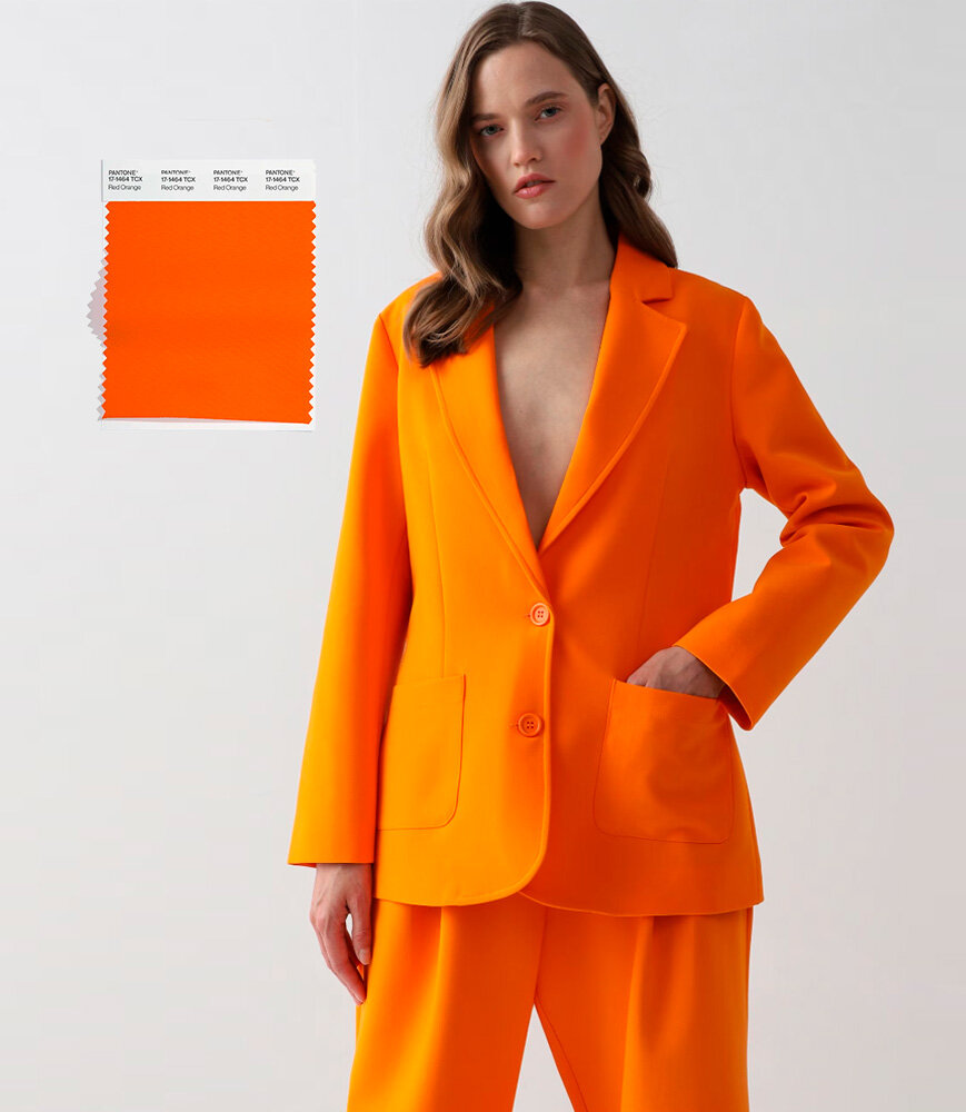 Яркая осень – не просто слова, а целый спектр эмоций, которые нам предлагает испытать новая палитра Института цвета Pantone. Тут и очевидные сезонные хиты, и нежданные гости – вроде «типично летнего» оранжевого и охлаждающего голубого. Начинаем цветотерапию по всем заветам психологов: у осенней хандры просто нет шансов! PANTONE 19-1555 Red Dahlia — Красный георгин Какая осень без насыщенного красного – это наш рдеющий флаг того, что мы в курсе трендов. В этот раз страстный яркий оттенок идёт на усложнение: получает коричневато-бордовый подтон, благодаря которому смотрится статусно и благородно. Примерьте его в верхнем регистре – в виде роскошного блейзера с эффектной бархатной фактурой или делайте вторым слоем в виде акцентов – ярких и контрастных 3D-рисунков на лёгком эластичном пуловере. Детали: брюки из эластичной ткани, ботильоны из замши со сборкой, эффектное кольцо. PANTONE 17-1464 Red Orange — Красный Оранжевый Нежданно жизнерадостный оттенок в палитре, который принято счита