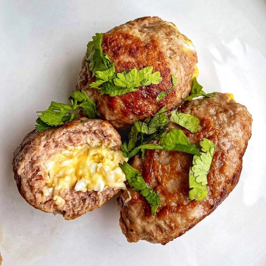 Кбжу на 1 шт : 254/14.3/20.1/3.9 На 100 г: 244/13.8/19.4/3.7 Ингридиенты: Фарш - 800 г ( у меня смесь из говяжьего и индейки) Мука рисовая ц/з - 40 г Яйцо - 1шт Соль, специи по вкусу Для начинки : Яйцо 2 шт (среднего размера, отварить) Масло сливочное -10 г Сыр 17%- 50 г Сметана 15%- 15 г ⠀ Приготовление: Смешиваем все ингредиенты для котлет . Готовим начинку: Яйца и сыр натереть на мелкой тёрке , добавить растопленное сливочное масло ,сметану. Хорошо перемешиваем. Берём фарш, в середину кладём 1 ч л начинки. Защипнуть края и сформировать котлеты. Обжаривам котлеты с двух сторон пару минут на сухой сковороде, до румяной корочки. Далее переложить котлеты в форму для запекания , накрыть сверху фольгой (так они сочнее получатся ) и отправляем в духовку при 180 гр на 25-30 мин. Приятного аппетита 🤍🤗