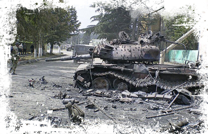 На перекрёстке были фрагменты сгоревшей техники, разорванные из-за детонации боекомплекта, танки. Город оставлял унылое впечатление, мы подъехали к железным воротам, где ранее располагались миротворцы.