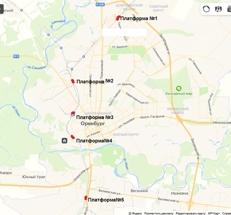 Так, станции могли бы быть расположены – в районе платформы 10-й км в Степном, далее платформа Львовская в Промышленном районе, далее ж-д Вокзал, затем, возможно, нужна новая платформа в районе ТК Губернский (после ж-д – переезда, недалеко от конечной остановки маршрутов 26, 39, троллейбуса 12), далее в Зауральной части города, на станции Меновой двор, или вблизи существующей автодорожной развязки, вблизи остановки общественного транспорта «База ОПС».