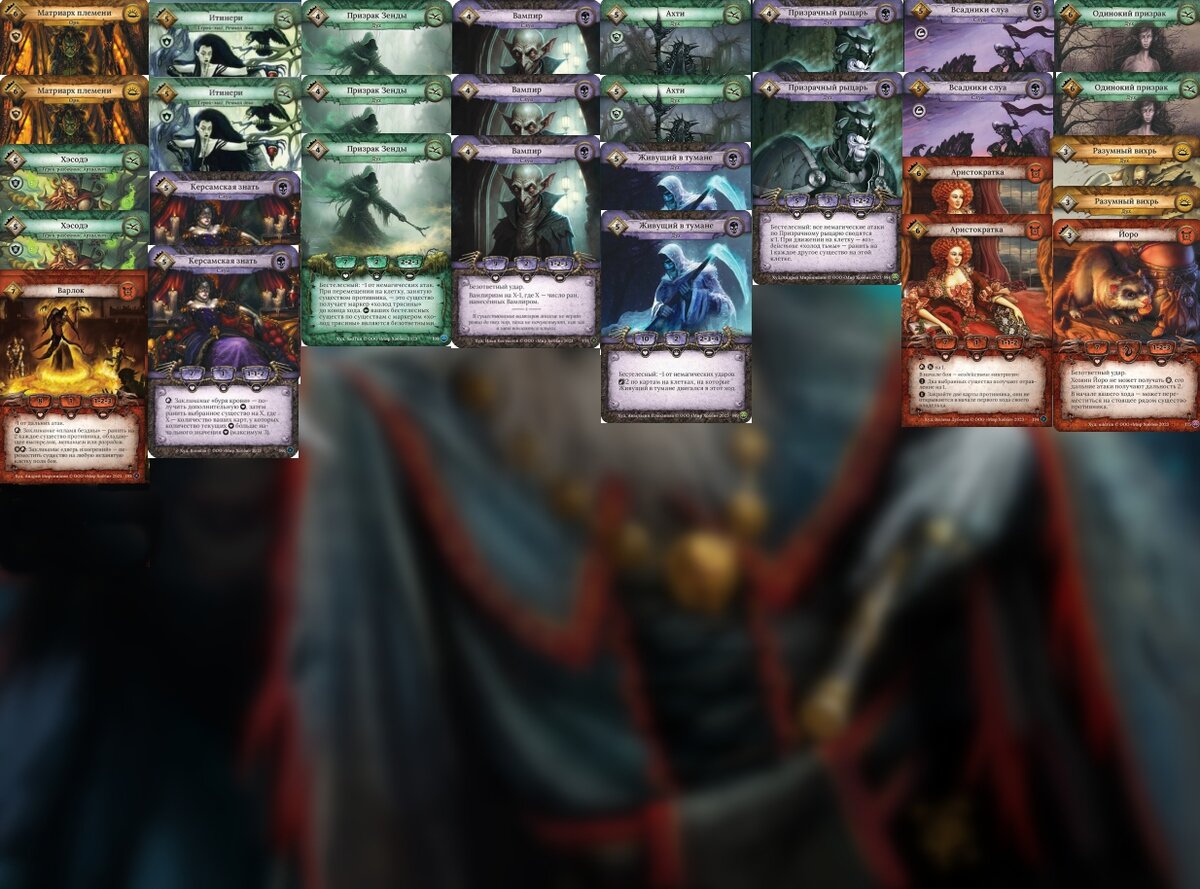 Так же отряд под второй ход, уже с матриахом племени с фишкой, с 2 призрачными рыцарями и вампирами, что делает данный отряд серьёзной угрозой для большинства колод.