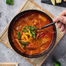 Красное тайское карри - это вкусное и ароматное блюдо с острым перцем, кокосовым молоком и различными ингредиентами. Вот рецепт для приготовления красного тайского карри: Ингредиенты: Для пасты: 1. Красные чили - 2-4 шт. (в зависимости от желаемой остроты). 2. Лук-шалот - 2-3 шт. 3. Чеснок - 3-4 зубчика. 4. Лемонграсс - 1 стебель (только белая часть, нарезанная). 5. Галангал (или имбирь) - 1 кусочек (по желанию). 6. Кориандр (корень или порошок) - 1 ч. ложка. 7. Кумин - 1 ч. ложка. 8. Красный перец - 1 ч. ложка (по желанию). 9. Листья каффир-лайма - 2-3 шт. (по желанию). 10. Соль - 1 ч. ложка. Для супа: 1. Кокосовое молоко - 400 мл. 2. Вода - 1 чашка. 3. Мясо (курица, свинина, говядина или креветки) - 300 г (по вашему выбору). 4. Овощи (бамбуковые ростки, баклажаны, перец и др.) - 2 чашки (нарезанные). 5. Рыбный соус - 2-3 ст. ложки (по вкусу). 6. Пальмовый сахар (или сахар) - 1 ст. ложка. 7. Листья свежей мяты и базилика - для украшения. Инструкции: 1. Для приготовления пасты: в