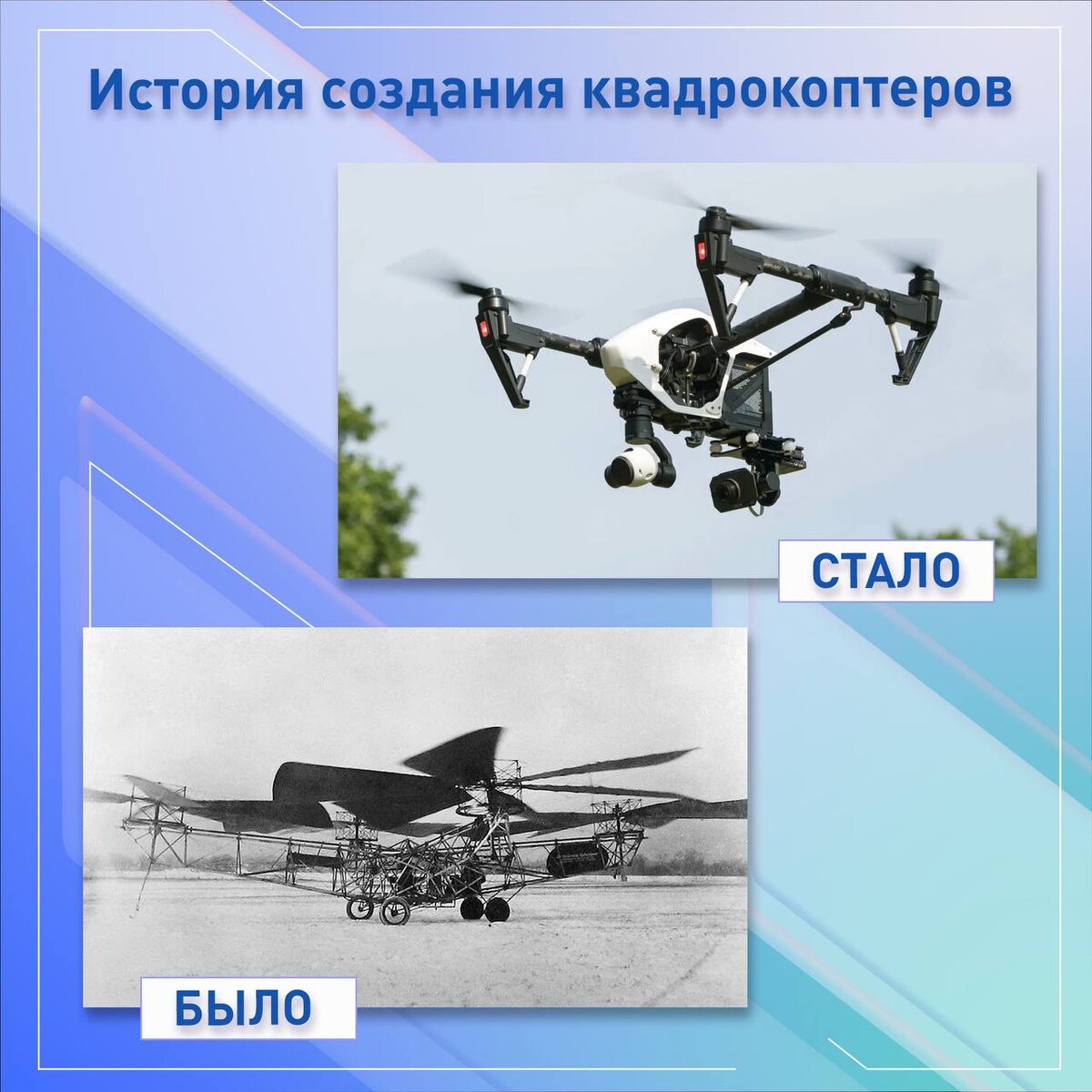 ❗️БПЛА позволили человечеству совершить настоящий рывок через столетия В 1920-х годах авиаконструктор Георгий Ботезат создал и испытал первый пилотируемый коптер с четырьмя роторами. Конструкция могла оторваться от поверхности земли на 5-15 метров и зависнуть. Но механизмы, позволяющие летательному аппарату долгое время парить в воздухе, еще не были разработаны. Поэтому применение квадрокоптеров стало набирать обороты лишь в XXI веке. Современные БПЛА способны: 🔹 летать более 2-х суток; 🔹подниматься до 6000 метров; 🔹набирать скорость до 800 км/ч. Они эффективны во многих сферах жизни общества, например: способны залетать в труднодоступные человеку места и передавать картинку оператору, помогают пожарным, применяются в науке, картографии, космосе, доставляют продукты питания, могут снять фильм, охранять территорию и этот список можно еще долго продолжать… Сейчас дроны являются неотъемлемой частью нашей жизни. Они подарили множество неочевидных возможностей, позволяя экономить р