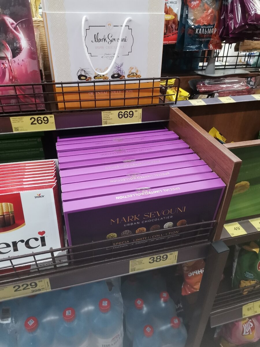 Все думала о том, что хочу поделиться с вами некоторыми любопытными продуктовыми находками из "Красное&Белое", но каждый раз их было недостаточно для полноценного обзора. Теперь же, когда набрался небольшой список того, что хочется обсудить, я предлагаю вам вместе взглянуть на некоторые хорошие продукты на полках этого магазина. Обычно я делаю акцент на выгоду и экономию, но в этот раз я подготовила то, что мне нравится, то, что я бы с радостью купила повторно, несмотря на цену. При этом отмечу что по-прежнему считаю этот магазин наиболее привлекательным в плане цен, если сравнивать его с другими супермаркетами и сетевыми магазинами. Да, ассортимент уже, но главное что найти в нем что-то толковое удается. Кругами ходить вокруг вступления не будем, поэтому презентую первую находку, которая довольно ярко выделяется на фоне остальных (и ценой, и всем остальным): То, что здесь есть конфеты в коробках, видел, наверное, каждый, но обращали ли вы внимание, что есть более "изысканные варианты"