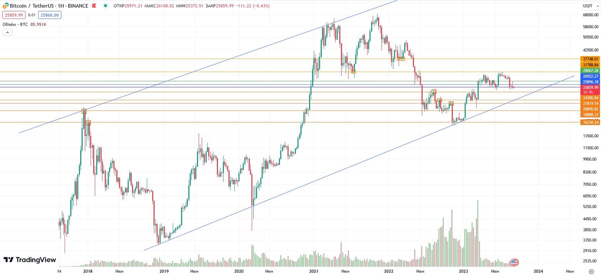 Пока цены на акции пробивают очередное дно, посмотрим на биткоин. Движемся в восходящем тренде на недельном графике. По-моему мнению выше не пойдём, пока цена не коснётся линии поддержки тренда. Произойдёт это не раньше ноября или в лучшем случае конце октября. Пытаться торговать флэт на том же двухчасовике с его узким диапазоном - это слишком большой риск по той причине, что цена может улететь куда угодно в любой момент, вниз или вверх. Да и много тут не заработаешь из-за ширины флэта. Так что остаётся наблюдать.