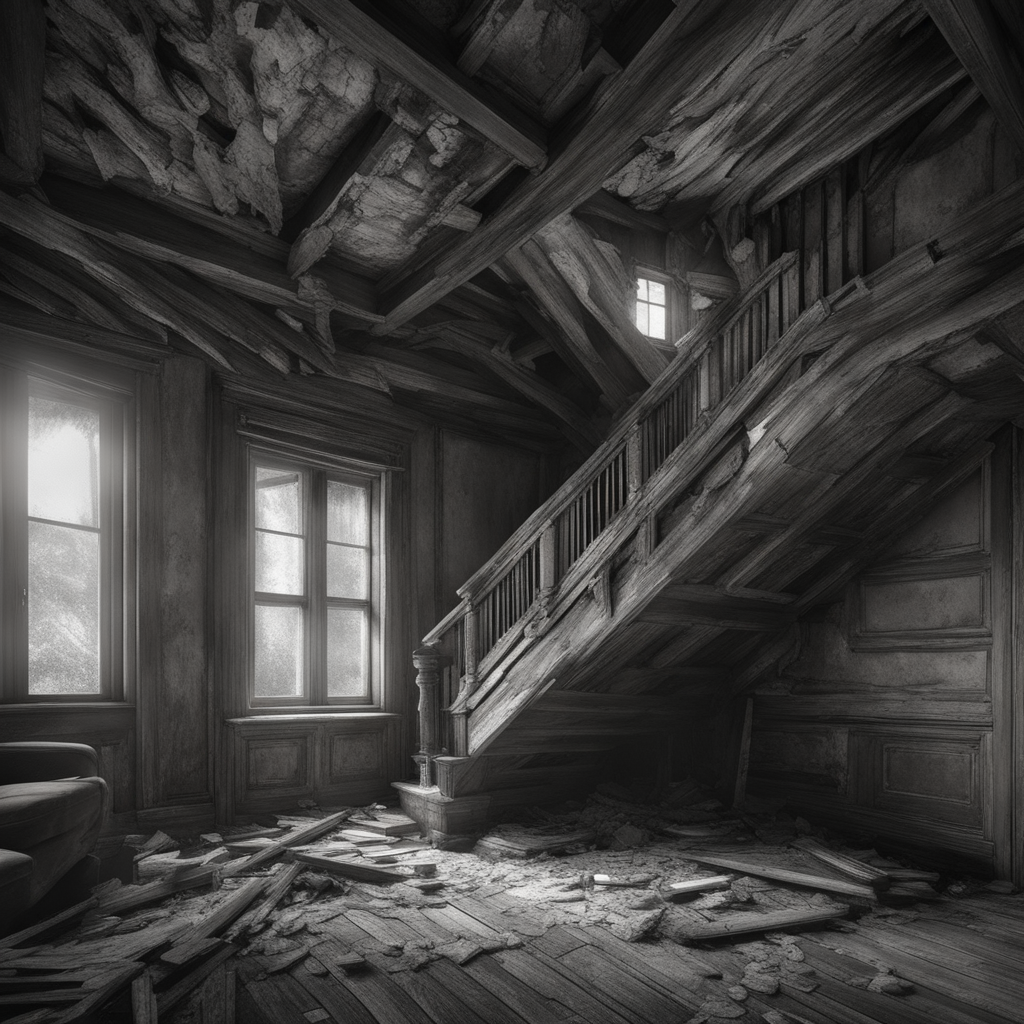 Выглядел дом ужасно, стёкол в окнах не было, входная дверь висела на одной петле. Широкая деревянная лестница, ведущая к квартирам второго этажа почти полностью сгнила. С большими предосторожностями, опасаясь в любой момент провалиться, компания всё же смогла подняться на второй этаж, так как на первом ничего интересного ребята не нашли: мебели не было, квартирные двери отсутствовали, штукатурка на стенах осыпалась, обнажив где-то каменную кладку, а где-то и просто деревянные доски, разделявшие комнаты.
