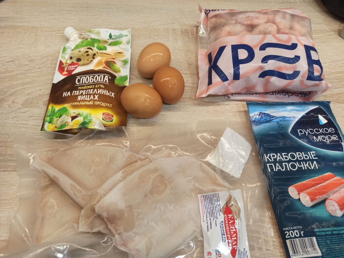 Здравствуйте. Как обычно на ночь глядя решила поделиться рецептом вкусного салатика. И так нам понадобится: Кальмары 400 гр, Крабовые палочки 100 гр, Креветки 300 гр, Яйцо куриное С 1 -3 шт, Майонез 2,5 ст. л, Тарталетки салатные, Соль по вкусу, Перец по вкусу Начинаем мы с самого сложного, а именно моем и очищаем кальмары от кожицы. Даже если производитель заявляет, что кальмары чищеные, не верьте. Последняя кожа всегда остаётся она тонкая и матовая, ее проще снять перед варкой. Кальмары опускаем в подсоленную кипящую воду и отвариваем около 3 минут, если кальмары большие не более 4минут. Это ВАЖНО!!! Тогда кальмары будут мягкими и сочными. Помнится, когда мне было 18 лет я делала данный салат и честно говоря не знаю, как моя семья его ела. Информации раньше было немного и я варила кальмары около 20 минут, ну чтобы точно сварились. Какой кошмар, они были настолько резиновые, что их даже толком и прожевать было нельзя. Все приходит с опытом, и вот спустя 15 лет, я можно сказать Гуру