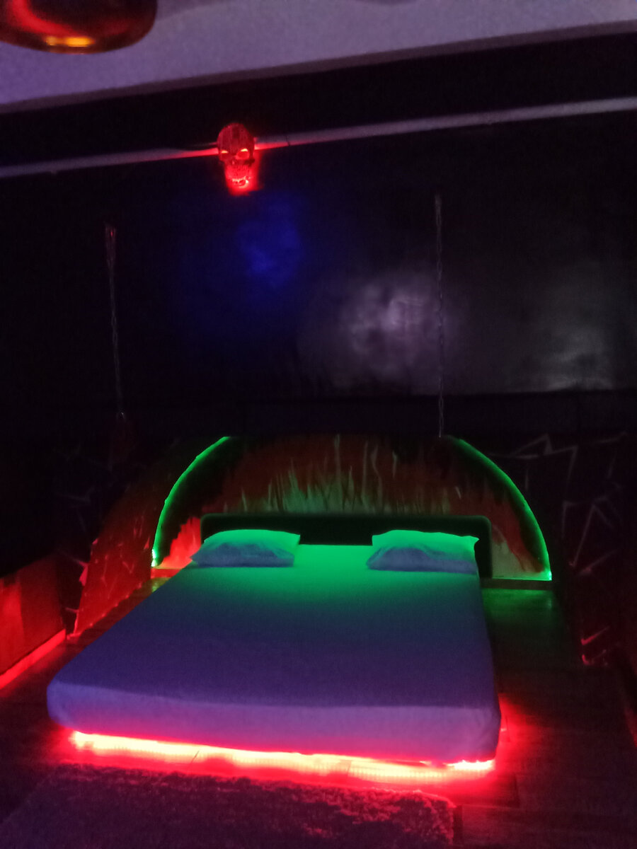 Как вам интерьерчик? Присмотритесь, там горит лампа в виде черепа над кроватью, а сама кровать на полу над низко нависающим сводом. Подсветка призвана передавать атмосферу ....эээ...прожарки)). Свисают цепи, но с моим вот уровнем акробатической анти-подготовки, а также с объективным недостатком сантиметров росту, всунуть ноги в кандалы подвесные не вышло. Вернее, не вышло просунуть, чтоб зафиксировать. И вся гениальная, вообщем-то, идея пошла на смарку. Потому как ежели в них руки совать, то надо вставать. Лицом к черепу, к лесу задом. И возвышаться над не-покрустовым ложем. То есть, кандалы придуманы для порки стоя или полу-стоя, можно даже где-то с отклячиванием определенных частей тела. Ежели они, конечно, у тех, кого порят в буквальном, а не переносном смысле слова, они есть. Потому как ежели верить, так сказать, специальной кинематографии, то пороть предпочитают худых аки твои шкелеты)). По костям да ремнем? Лажа какая-то. Как по мне, ни скольжения тебе артистического, ни звука см