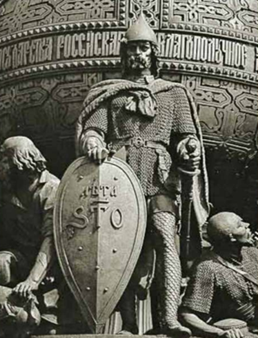 Скульптурное изображение князя Рюрика (годы жизни 830-879) на памятнике в Великом Новгороде, установленным к тысячелетию Руси.