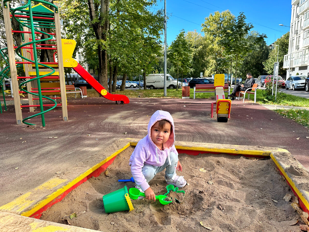 У Алины тут выросла нога на сантиметр за 3 месяца. Мы прилетели, а носить нечего. Вся обувь 23 размера дочке мала. Я еще в Таиланде стала замечать, что пальчики из босоножек уже вылезли за их пределы. Зато кроксы, которые были велики (24 размер) сейчас в самый раз. Вчера утром ходили гулять в сандалиях с носком, на сон Андрей съездил в детский мир и купил дочке кеды 24 размера. Забыл взять с собой стельку, нашел линейку в канцелярских товарах и мерил ей. Сейчас у Алины нога 14,7 см. По стельке кеды 15,7 см. Еще добавится носочек. Вчера вечером ходили гулять, вроде топает нормально, но чувствуется, что немного велики. Один раз не рассчитала на какую высоту поднять ногу на ступеньку и чуть не покатилась с лестницы вниз, муж поймал. Покупать половинчатые размеры на короткое время не хочется. Вдруг у дочки за неделю нога еще вырастет. Вчера гуляли утром на двух площадках, Алина уже освоилась, забирается и сама катается с горок. Мы ее внизу только ломим, потому что при съезде она сваливаетс
