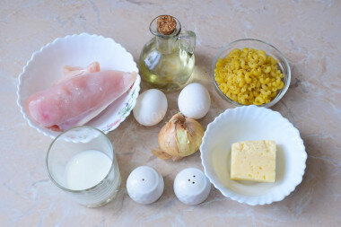 Ингредиенты: 1 Шаг. Подготовте все необходимые ингредиенты. Макароны модно брать любые, по вашему вкусу. 2 Шаг. Макароны необходимо заранее отварить, действуйте по инструкции. Макароны должны быть мягкие. Как Макароны с варятся, их необходимо промыть под холодной водой и оставить, что бы вода стекла. 3 Шаг. Лук очистите от шелухи и нарежьте на средние кусочки. С курицей необходимо сделать тоже самое и выложите все вместе на сковороду. 4 Шаг. Обжаривайте все вместе на среднем огне в течении 5-7 мин. Можно посадить и добавить специи. 5 Шаг. Затем смешайте обжаренную курицу с макаронами. 6 Шаг. Форму для запекания смажьте растительным маслом и выложите макароны с курицей в неё. 7 Шаг. В отдельной миске смешайте молоко и яйца, добавьте соль и специи. Смешайте все вместе. 8 Шаг. Полученную смесь влейте в макароны более менее равномерно э. 9 Шаг. Сверху посыпьте натертым сыром. Поставьте форму в духовку, предварительно разогретую до 180 градусов, на 20-30 мин. 10 шаг. Готовая курица с макаро